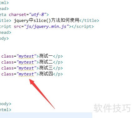 1、 创建一个名为test.html的文件,用于演示jQuery中slice()方法的使用方式。
