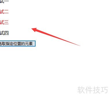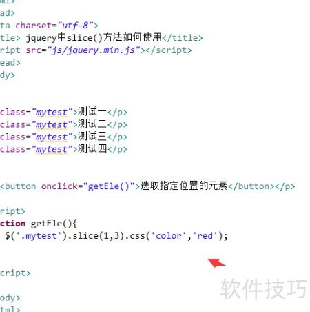 5、 在js标签中定义getEle()函数,函数体内通过class选择器获取p元素,利用slice方法截取从索引1到索引2的元素对象(索引从0开始),然后调用css方法为这些选中的元素设置文字颜色为红色,实现指定范围元素的样式动态修改。