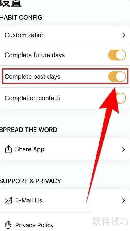 3、 Complete past days后方的圆点变成灰色,说明已成功关闭习惯追踪中的补全过往日期功能。