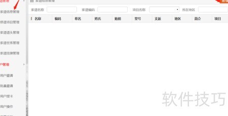 2、 登录后进入修谱王主界面,选择谱管理中的家谱信息管理,即可显示家谱信息页面,所示。