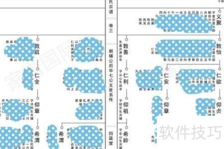 7、 苏式家谱采用竖线连接各代,左右开页直行下垂,无横线相连,图表从右至左排列,操作时依次选择右侧的数据设置、显示设置并确认。