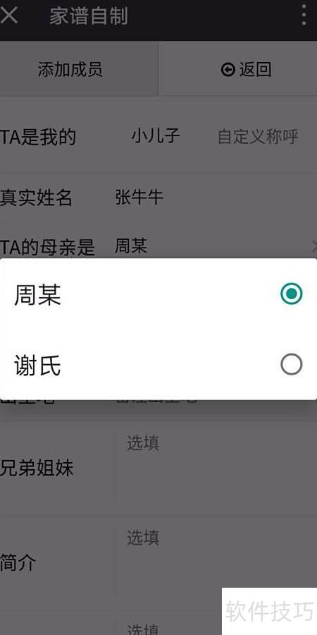 4、 点击添加成员后,可录入父母、配偶及子女信息,完整填写后即可生成一个包含三代成员的家谱。众所周知,父母与子女关系具有唯一性,但配偶可能不止一位,这通常源于离异或丧偶后的再婚情况(非重婚)。男性用户可在同一谱系中直接添加多位配偶,而女性若有多段婚姻,系统仅允许在当前家谱中添加一位配偶,其余配偶需另建新谱记录。这意味着女性可以拥有多个家谱,而男性仅能建立一份。因此,在填写个人资料选择性别时需格外谨慎,因为性别一旦确定,将直接影响家谱结构与配偶信息的录入方式,对整体家族脉络的呈现具有重要影响。