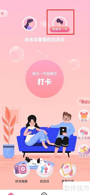 2、 所示为情侣专属空间,进入后邀请伴侣加入,成功绑定即可共同打造专属于两人的线上温馨小天地。