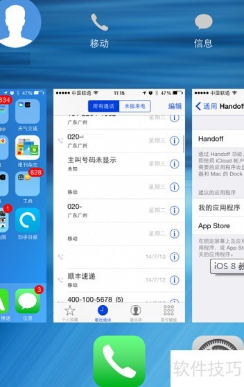 4、 iOS 8在界面设计上的最大亮点之一,是双击Home键后多任务界面中新增的一排联系人头像。操作十分便捷,只需双击即可查看。点击任一头像,便可选择通话、短信或FaceTime等多种方式快速联络,极大提升了沟通效率,让常用联系人触手可及。