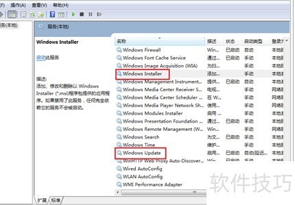 4、 点击确认进入服务界面,检查Windows Installer与Windows Update是否已启动运行。