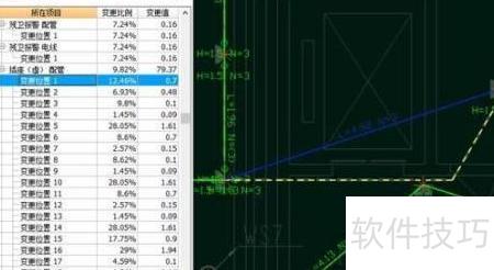 2、 管线变更表详细列出各最短路径计算项目,包含变更比例与数值,精确至具体位置,并可关联图形定位(图中虚线为原管线路径)。