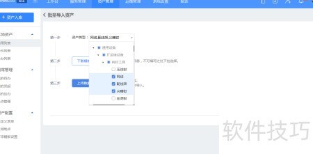 9、 支持资产批量导入,操作步骤为:点击批量导入,选择所需资产类型(可多选),下载模板并填写资产信息后上传完成导入。