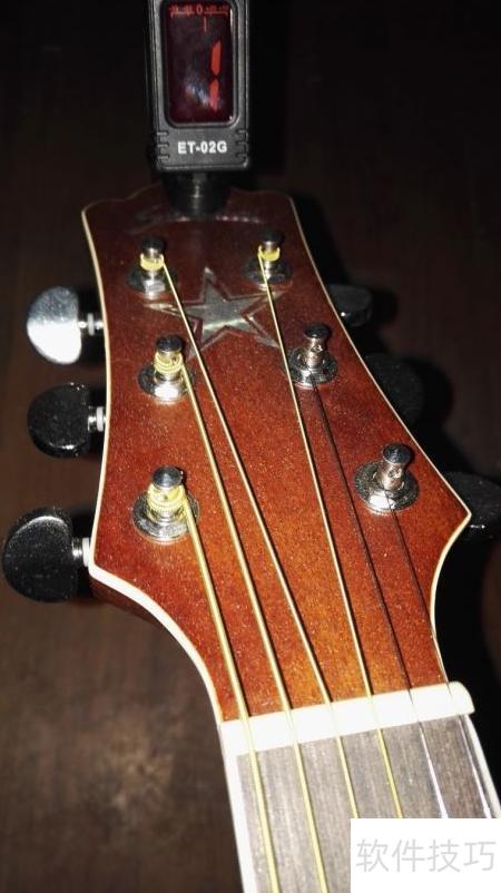 7、 使用调音器为吉他调音时,首先将调音器夹在琴头上并开启电源。以第一弦为例,若调音器显示红色且指针向左偏移,表明该弦音偏低。此时无论屏幕上显示的数字是1还是其他数值(如2至6),均说明一弦音高不足。应顺时针旋转一弦对应的调音旋钮,逐渐拧紧琴弦。持续调整直至指针指向中央的0位,同时调音器变为绿色指示,即表示第一弦已准确调至标准音高。重复此步骤可完成其余各弦的调音。