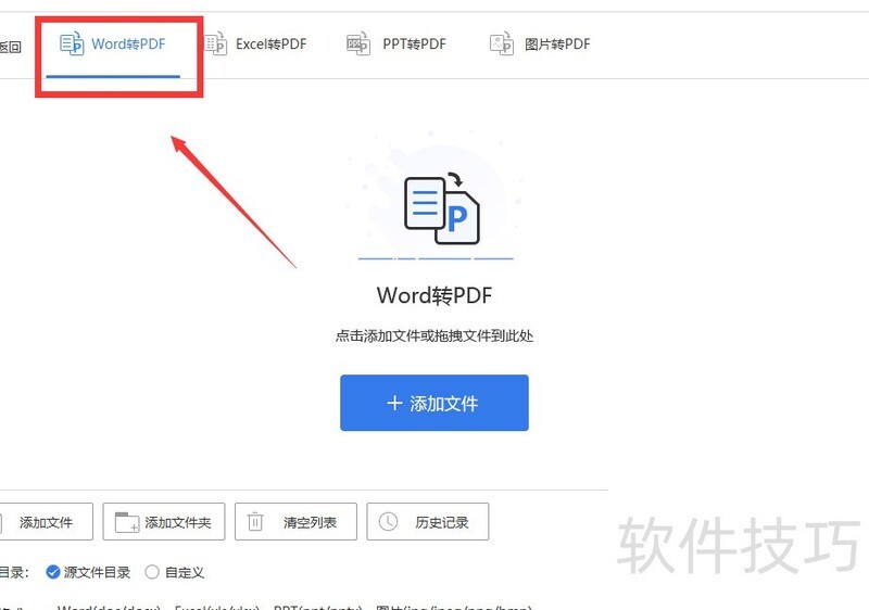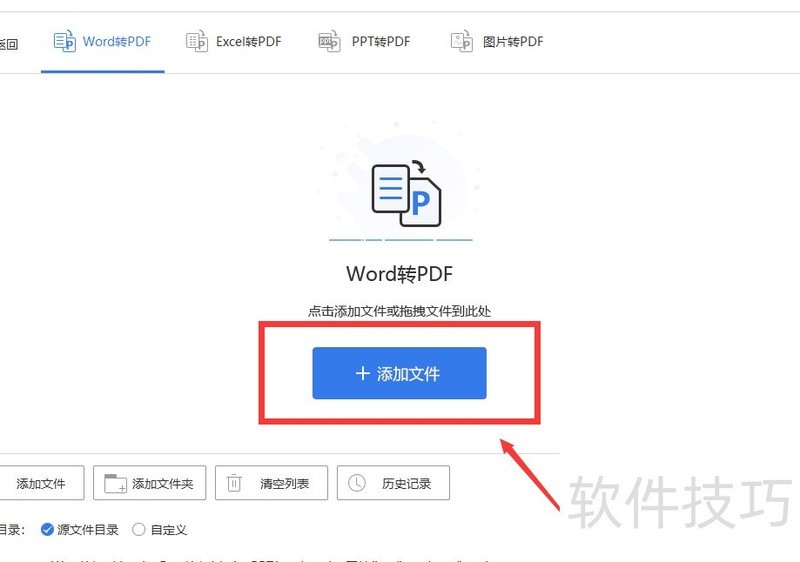 8、 点击中间的添加文件按钮,从本地选取需转换的Word文档。