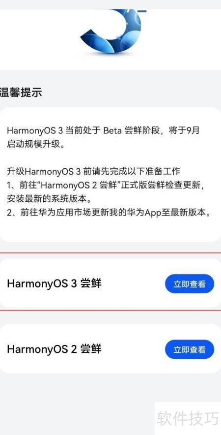 2、 进入升级尝鲜页面,点击HarmonyOS 3尝鲜右侧的立即查看按钮,操作所示。