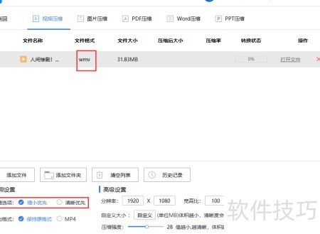 5、 压缩WMV视频时,可选择保持原格式压缩输出,或转换为MP4格式进行压缩输出,根据需求设置相应参数即可。