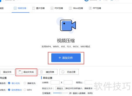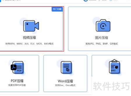 2、 双击已下载的软件,进入主界面后选择视频压缩功能。系统支持多种常见格式,包括MP4、AVI、FLV和MOV等,满足不同视频文件的压缩需求,操作简便,便于用户快速完成处理。