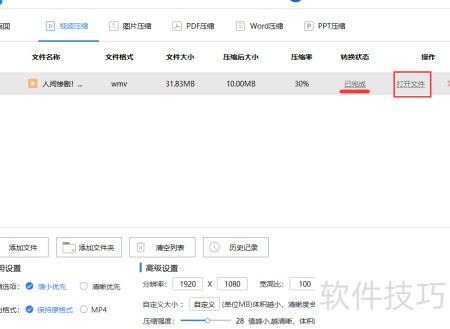 8、 WMV视频压缩完成后,状态将显示已完成,点击文件即可查看压缩效果。
