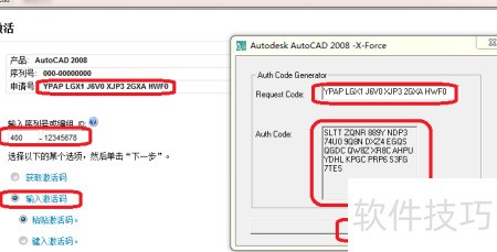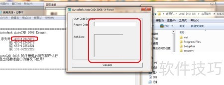 5、 在图示位置输入序列号,将申请号复制到CAD 2008 X-Force对话框中的请求码(Request Code)栏内,点击计算(Calculate)后生成一组数字,例如SLTT ZQNR 889Y……,随后将这组结果数字完整复制下来以备后续使用。