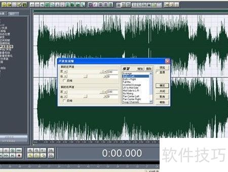 11、 在菜单栏中选择效果→波形振幅→声道重混缩,打开相应窗口,对整段音乐执行both=Left设置,完成声道合并操作。