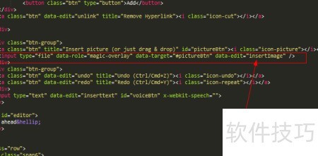 1、 打开示例文件中的index.html,查看图片添加按钮所绑定的事件,可见其绑定了名为insertImage的事件。