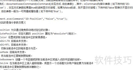 5、 `execCommand` 方法用于对当前文档、选中内容或指定范围执行特定命令,常用于操作 HTML 文档的格式与结构。其基本调用格式为 `document.execCommand(sCommand)`,其中 `sCommand` 代表要执行的具体命令名称,如2D-Position等。该方法通常还支持多个参数:第二个参数用于设定是否启用交互式界面,若设为 true,则浏览器会弹出相关对话框供用户输入;若设为 false,则不显示对话框,直接执行命令,例如使用false即表示关闭提示窗口。第三个参数为动态值,一般传入与命令相关的具体属性或可用值,如布尔值true或其他字符串,用于定义命令执行时的行为或样式设置。此方法在富文本编辑中应用广泛,可实现字体、颜色、对齐等多种格式控制。