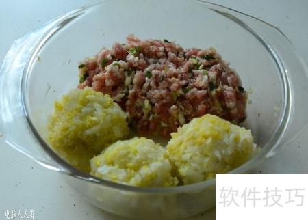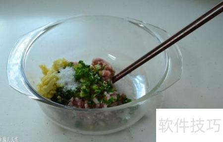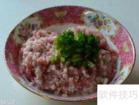 6、 将五花肉洗净剁碎,加入盐、糖、酱油、姜末、葱花和黄酒拌匀即可。