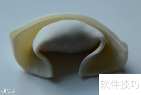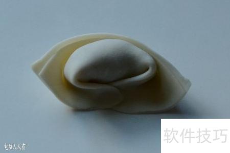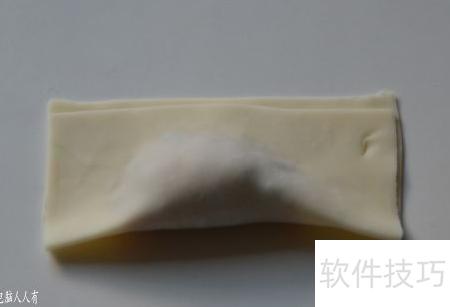 26、 将面皮对折后两端向中心聚拢,馄饨雏形便逐渐显现。