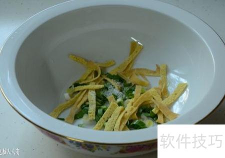 34、 将煎好的蛋皮切丝,加入大蒜、盐、猪油和鲜辣粉,冲入开水调成混沌汤,备用。