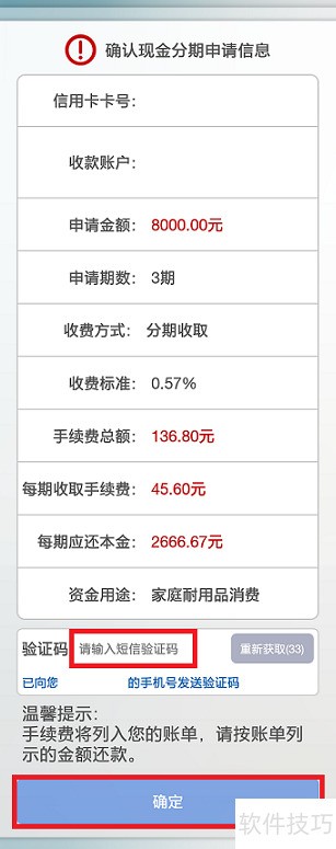 9、 核对现金分期信息准确后,输入验证码并提交确认,即可完成手机银行申请,随后等待银行审核结果。