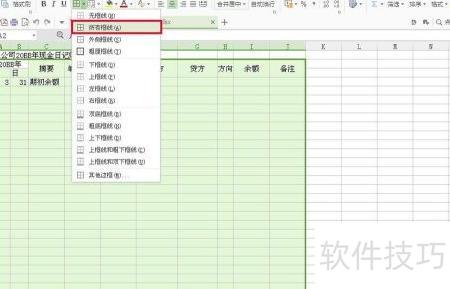 3、 选中A2至J28区域,点击开始选项卡中的边框按钮,选择所有边框,为表格添加完整线条,确保打印时显示边框,所示,现金日记账的基本表格已制作完成。