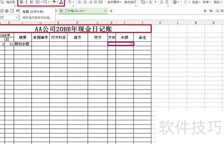 1、 新建空白Excel文件,将光标置于A1单元格,输入AA公司20BB年现金日记账作为表头,其中AA代表公司名称,BB代表年份。在登记现金日记账前,需先完成该表格的创建,确保信息清晰准确,便于后续账目记录与管理。