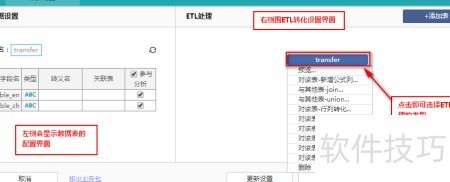 6、 随意选择一张数据表,例如transfer表,选中后点击下一步,页面将跳转至FineBI管理驾驶舱的数据表配置界面。此时展示的是transfer表的具体设置内容,左侧为表格属性配置区域,右侧为该表的ETL处理设置区域。在右侧中间位置设有表名按钮,点击该按钮后,即可选择所需的数据转换类型,便于后续的数据清洗与处理操作。