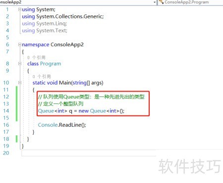 1、 启动VS并新建控制台项目,在Main函数内声明一个整型队列变量。