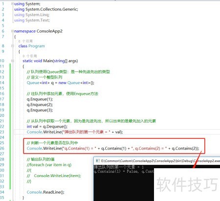 7、 通过Contains方法可判断指定元素是否存在于队列中。