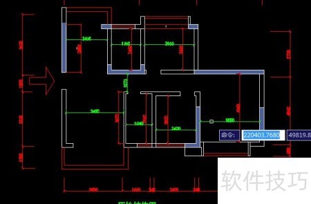 6、 以入户门某点为起点,开启正交模式,通过鼠标稳定控制方向,依据实际测量尺寸绘制线条,逐步完成整体框架。