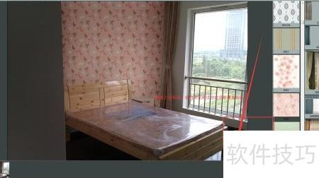 3、 选中准备好的墙纸,拖至对应墙面区域,右键选择属性,使用祛斑工具覆盖原有贴纸,操作完成后效果。窗户所在墙面采用相同方式处理即可。