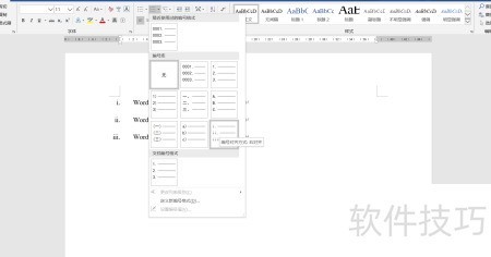 5、 在编号列表中选择常见的格式,找到并使用i、ii、iii样式。