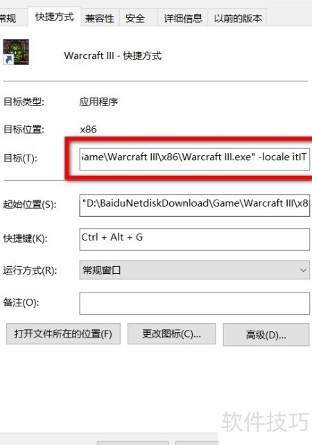 25、 在快捷方式属性的目标路径末尾添加空格后输入 -Locale enUS,以切换为英文界面。