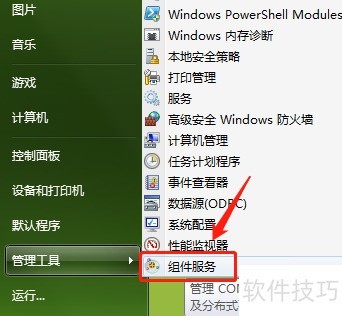6、 首先点击电脑上的开始图标,打开后进入菜单界面,接着找到并双击管理工具,在弹出的窗口中选择组件服务即可完成操作。