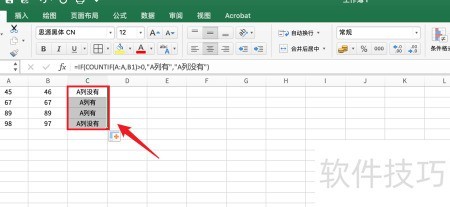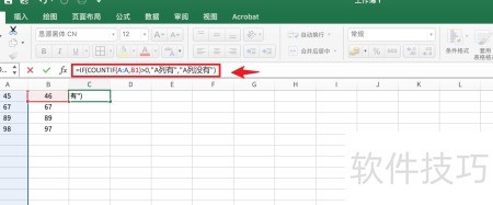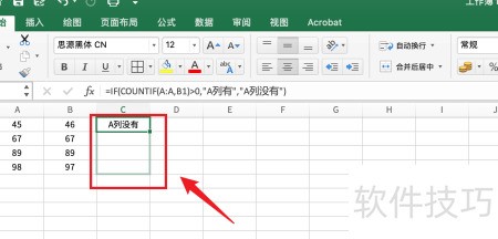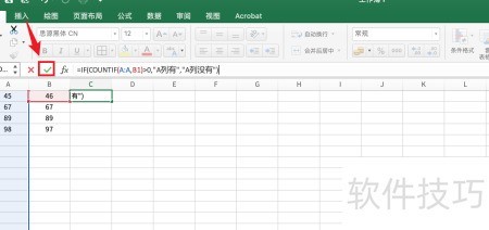 4、 在单元格中输入公式:=IF(COUNTIF(A:A,B1)>0,A列有,A列没有),用于判断B1内容是否存在于A列中。