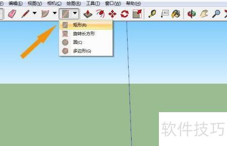 1、 启动SketchUp2018后,界面与菜单随即显示。用鼠标左键点击工具栏中的选择图形工具,然后选取矩形工具即可开始操作。