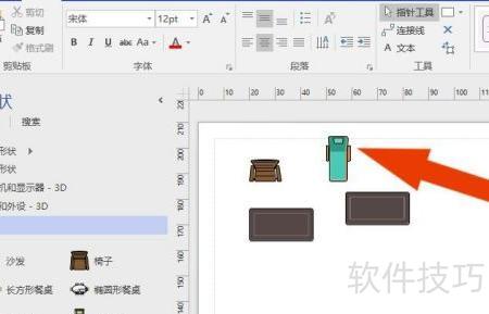 4、 在左侧工具栏中选择椅子与沙发图标,将其拖拽至画布进行绘制,效果所示。