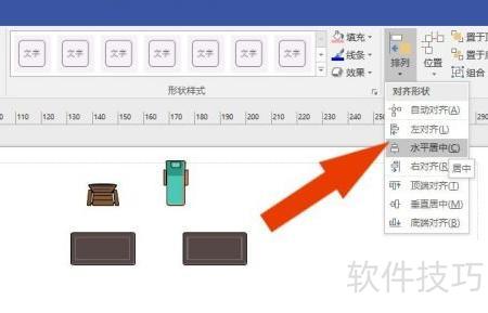 6、 选中桌椅图形,点击排列工具中的居中对齐选项,操作所示。