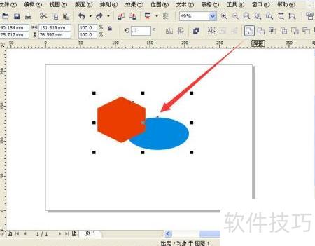 5、 移动图形使其部分区域按需重叠,重叠处即为焊接位置。注意下方图形的颜色将决定焊接后的整体颜色。由于蓝色图形位于下方,焊接完成后,整个图形呈现蓝色。所示。