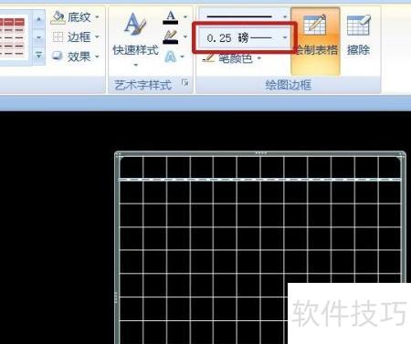 6、 将标题栏底部的加粗边框调整为与其他线条一致,进入绘图边框选项,把笔画粗细设为0.25磅。此时鼠标变成笔形,沿标题栏下方的粗线划过,使该线条变细至与其他表格线宽相同。最后完成整个方格图的绘制,确保所有边框线条均匀统一,整体布局清晰规范。