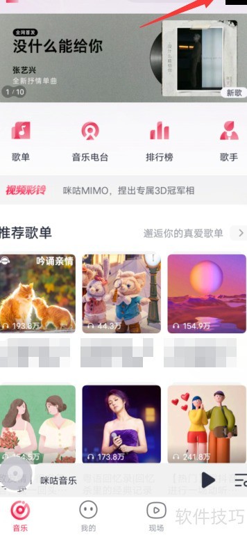 1、 打开咪咕音乐应用,进入音乐页面后点击右上角的三条横线图标。