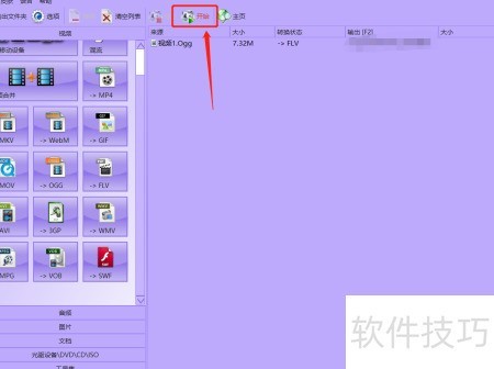 12、 回到软件主界面,已添加的文件会显示在列表中,点击工具栏上的开始按钮即可启动转换。
