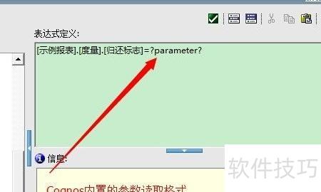 6、 接下来只需编写所需的过滤器即可,这里提供一个最基础的等值过滤示例,敬请谅解其简洁性。其中?parameter?中的内容为自定义参数名称,两侧的问号是Cognos系统用于读取参数的固定格式。