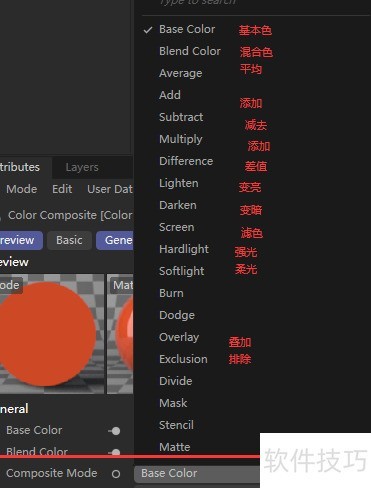 6、 点击颜色合成节点,于属性面板内调整其混合模式。