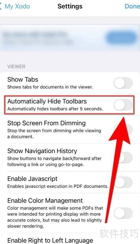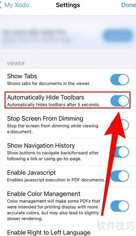 4、 当Automatically Hide Toolbars选项后的圆点变成蓝色时,表示Xodo的该功能已成功启用。