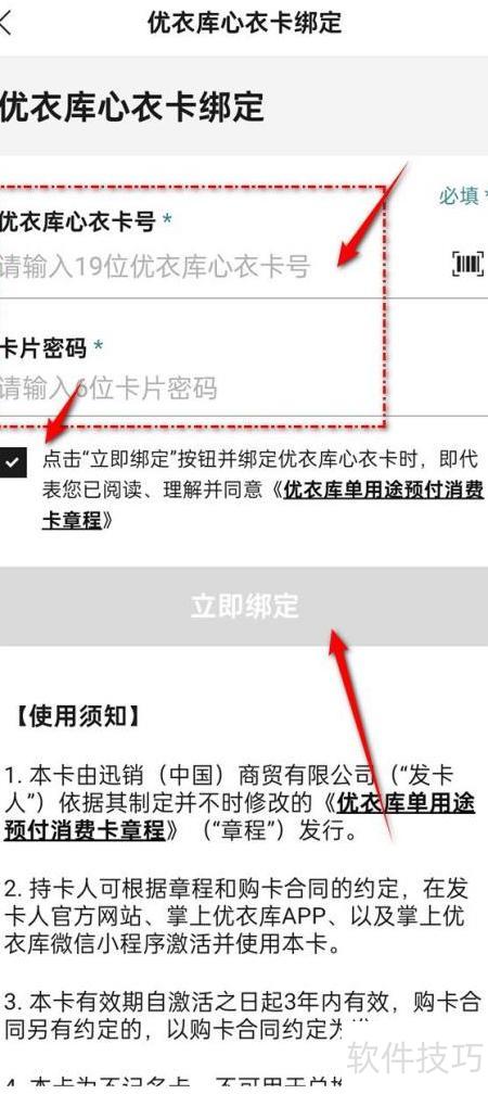 4、 输入优衣库心衣卡的卡号与密码,勾选同意绑定协议后,点击立即绑定即可完成绑定操作。