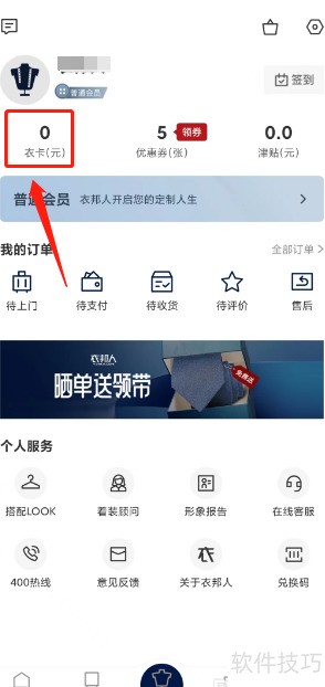 1、 打开衣邦人应用,进入个人中心,选择衣卡选项。