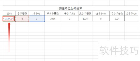 3、 1比特等于字节除以8,在对应单元格输入=K14/L14,然后依次填充其余公式即可完成计算。