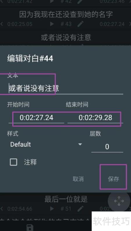 3、 选中需修改的文本段落,调整起始与结束时间以更新时间轴,按需求进行编辑,完成后点击保存即可。